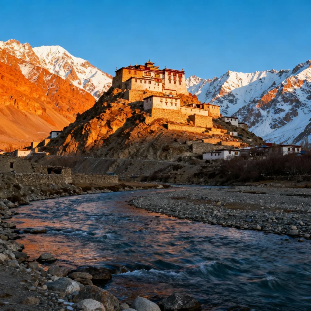 After breakfast, embark on one of India’s most scenic drives entering the mystical Spiti Valley. Cross from lush Kinnaur into the high-altitude cold desert of Spiti. At Khab, witness the dramatic confluence of the turquoise Sutlej and muddy Spiti rivers—a spectacular sight where two mighty rivers merge.