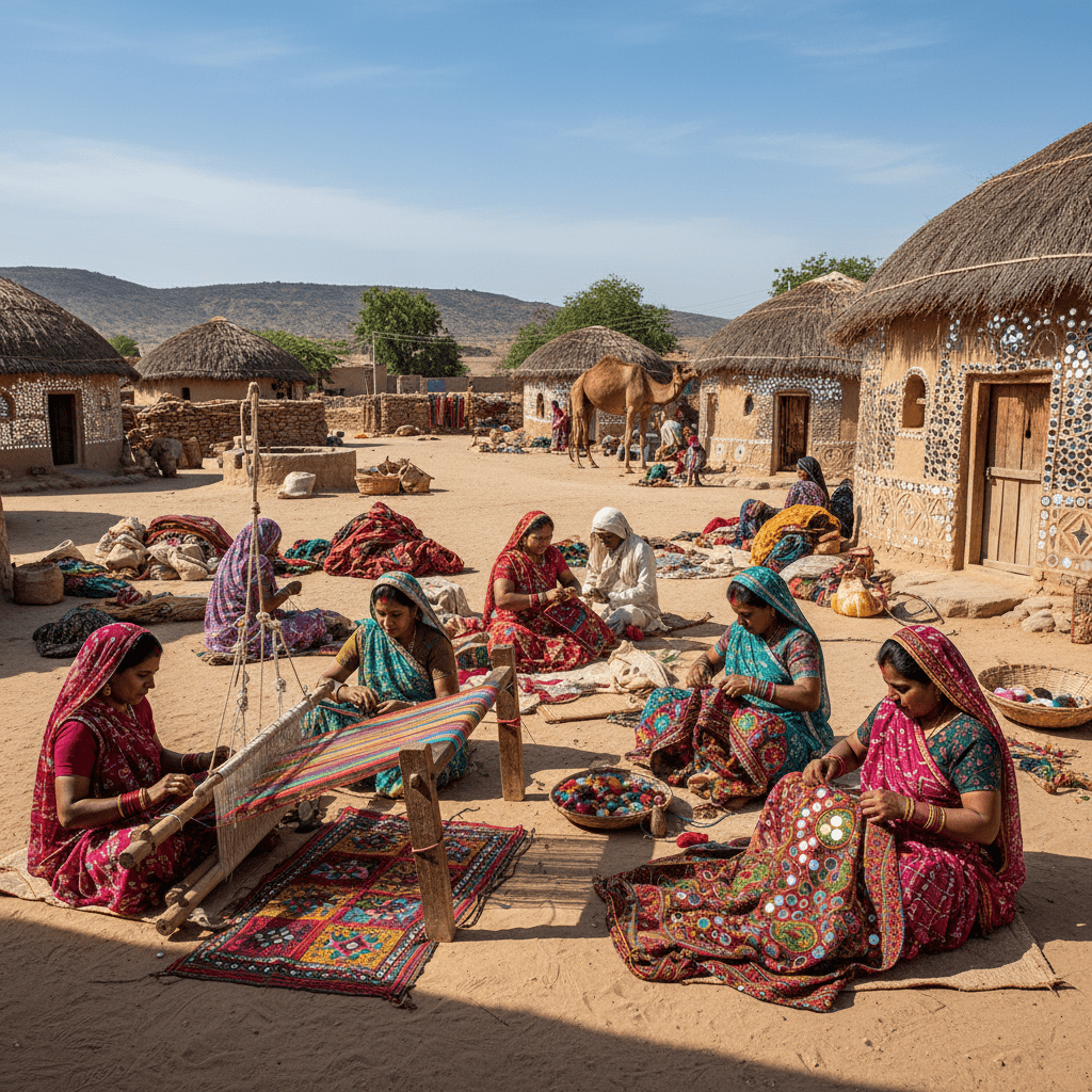 Interact directly with master embroiderers demonstrating intricate Kutchi, Rabari, and Ahir embroidery techniques