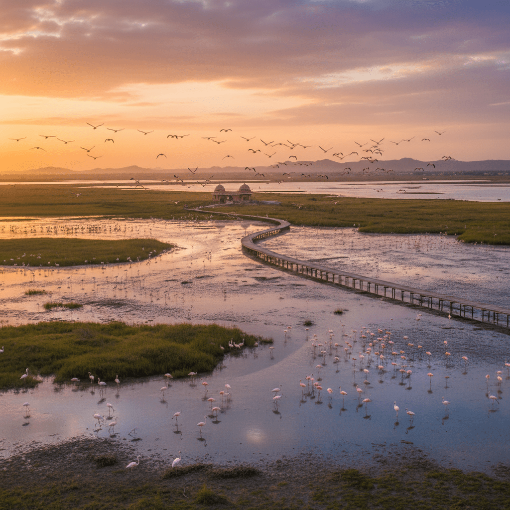 Late afternoon, transfer to the White Rann (Great Rann of Kutch) viewing platform to witness the spectacular sunset over the endless white salt desert. Watch as the setting sun paints the crystalline landscape in golden and pink hues, creating an ethereal atmosphere.
